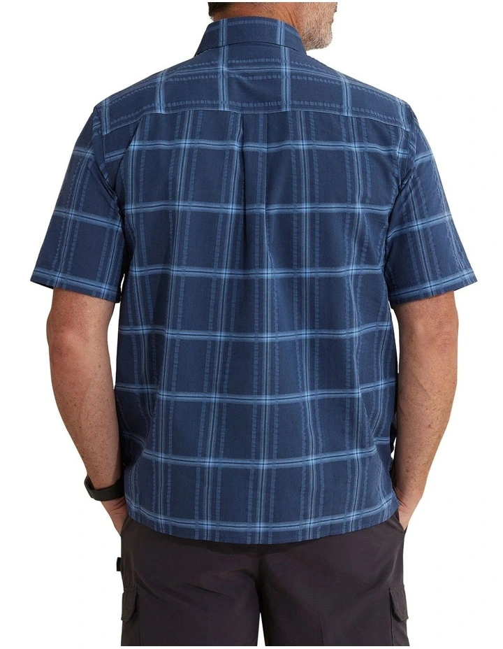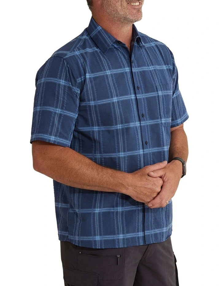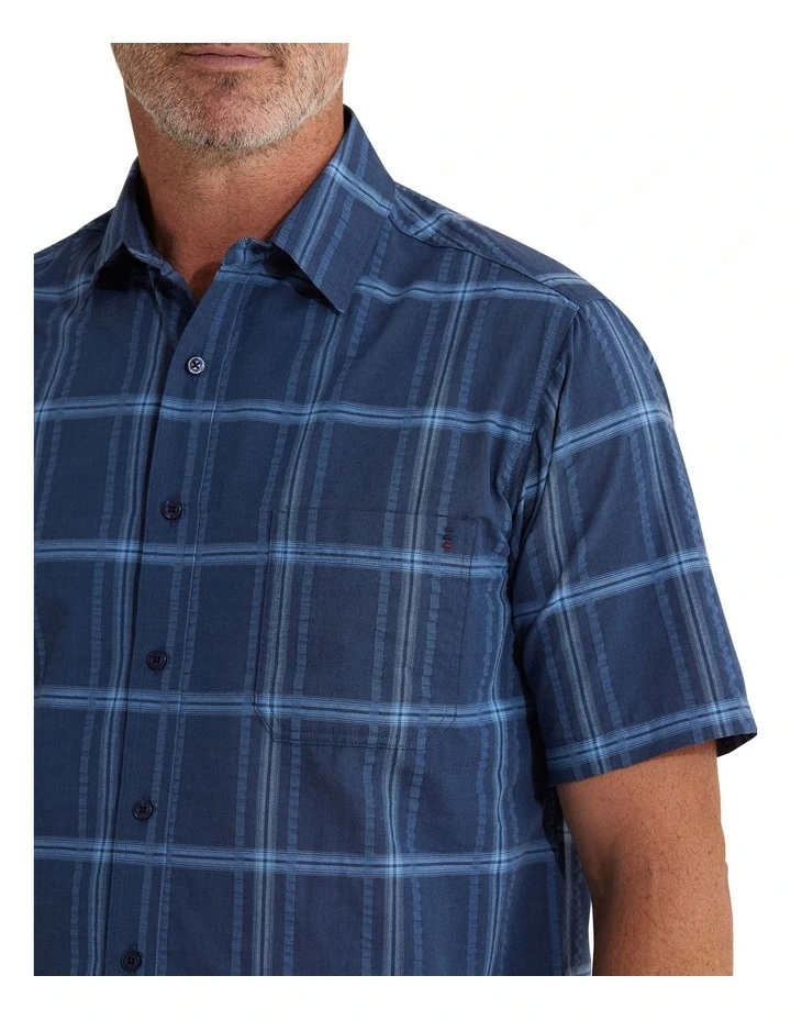 The Dao Seersucker shirt features a tonal check design in steel blue. Seersucker is a puckered fabric that is essential in summer as this feature causes the fabric to be mostly held away from the skin when worn, facilitating heat dissipation and air circulation. It also means that pressing is not necessary.