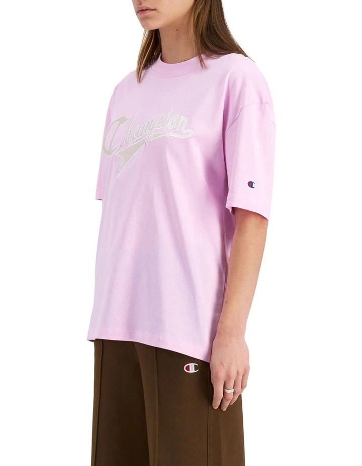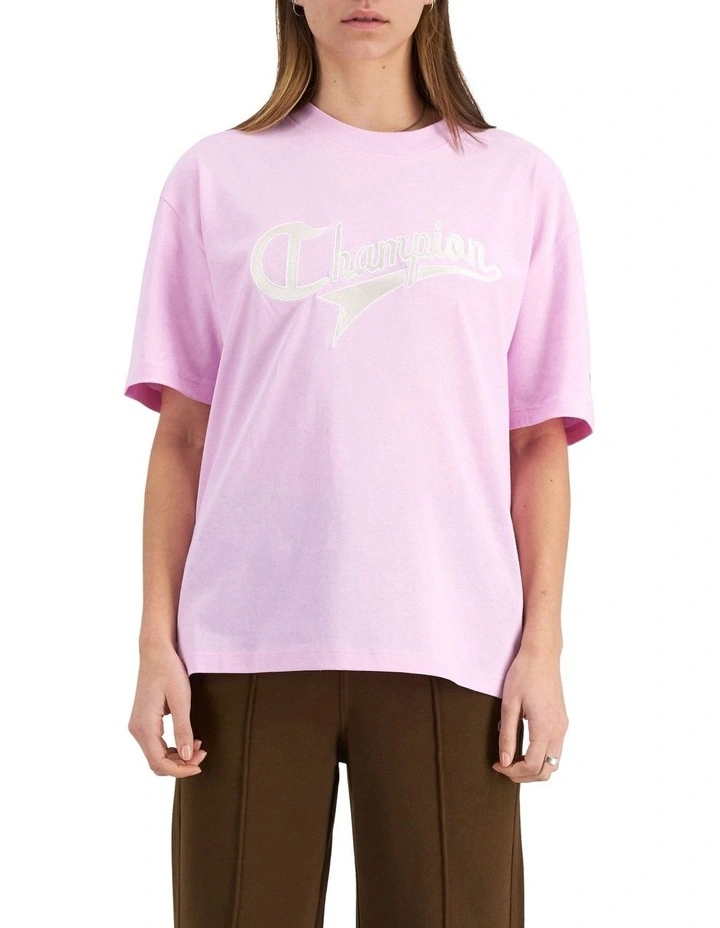 - Champion Collegiate tee with embroidered cursive Champion logo on chest