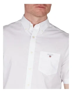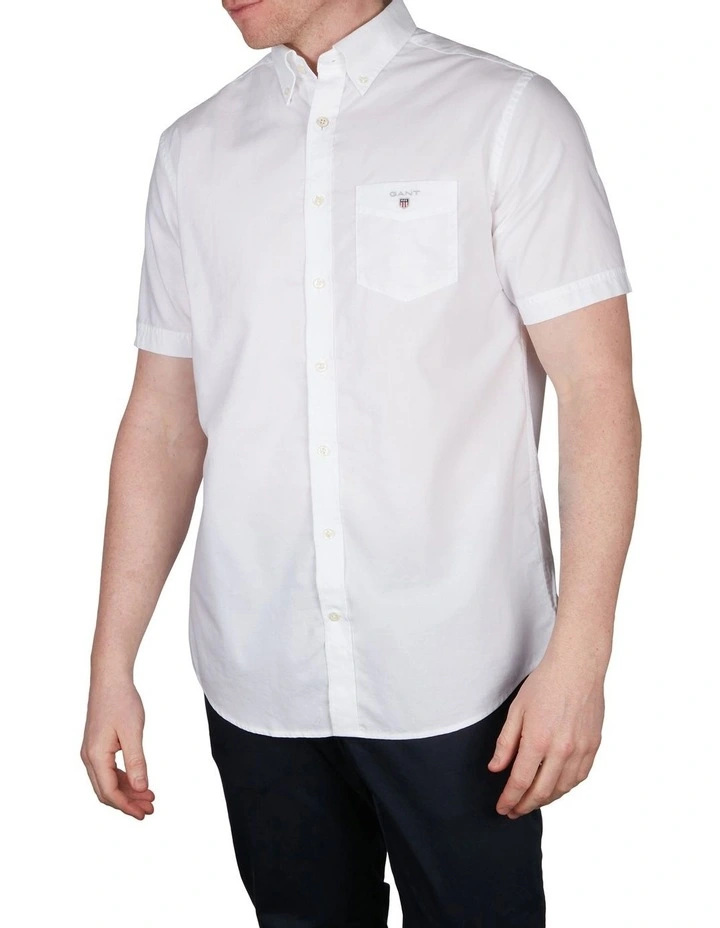 In an essential preppy weave, this Regular Fit Short Sleeve Broadcloth Shirt is a timeless staple for any wardrobe. With our signature button-down collar, chest pocket, and GANT logo embroidery, this short-sleeved shirt is perfect for wearing with chinos during the summer.
