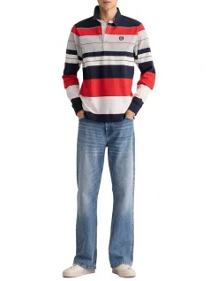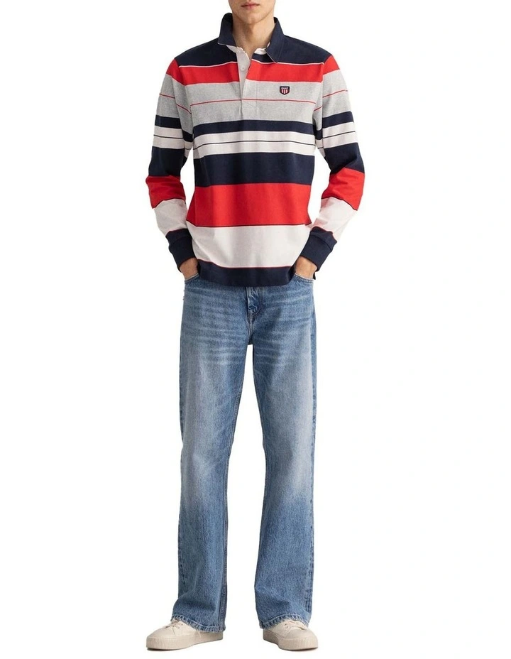 Featuring our ’90-style Retro Shield logo badge at the chest, this striped Heavy Rugger gives a collegiate feel with its classic twill collar and placket, side slits, and ribbed cuffs.