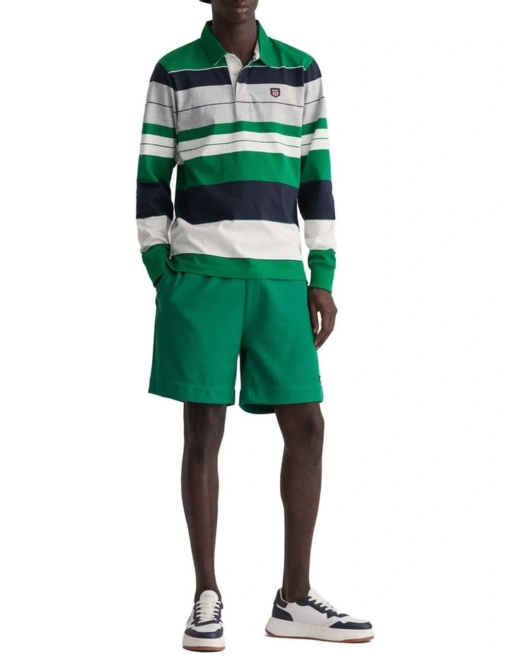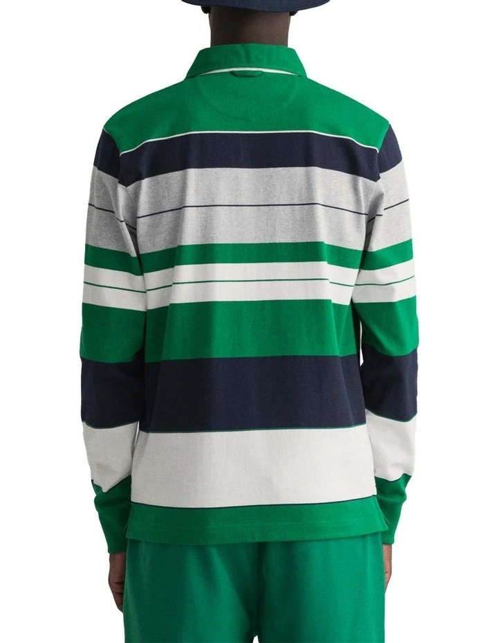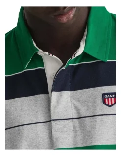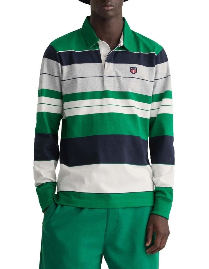 Featuring our ’90-style Retro Shield logo badge at the chest, this striped Heavy Rugger gives a collegiate feel with its classic twill collar and placket, side slits, and ribbed cuffs.