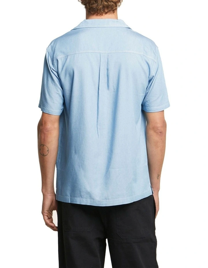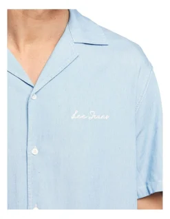 The Lee Chain Stitch Shirt in Light Indigo is a relaxed boxy fit, short sleeve shirt, with a resort style collar and traditional Chain Stitch Embroidery. Made in a light Tencel Chambray with a soft hand feel, wear this shirt open with a tee underneath casually to pub or buttoned up for a dressier look.