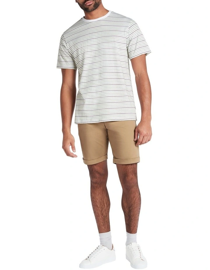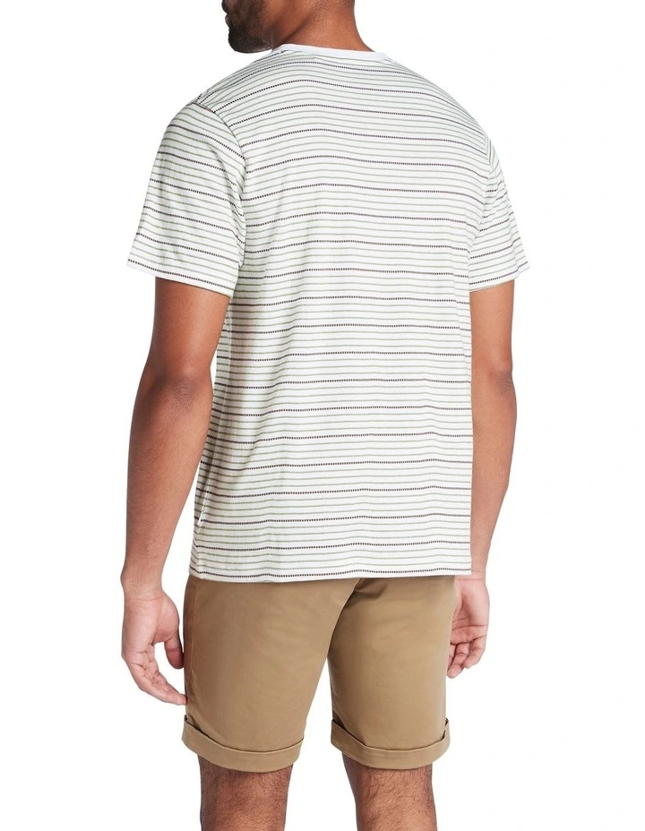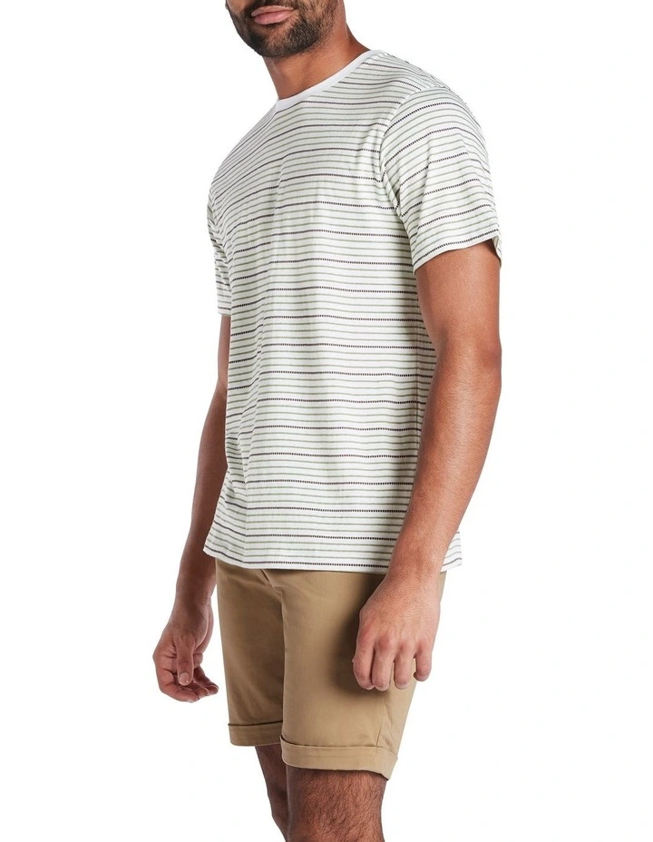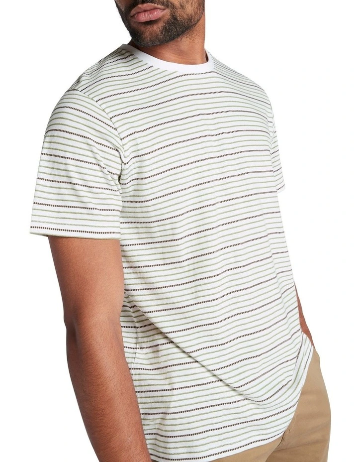 Delivering effortless pairability, this tee shows off a stitched horizontal stripe in shades of green and brown, set against a neutral ecru base. Lightweight and breathable, the tee keeps its cool in pure cotton, as it creates an easy relaxed fit with straight shaping through the body, classic short tee sleeves and a crew neckline with fine rib neckband.