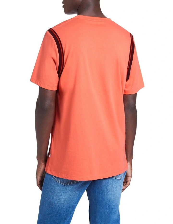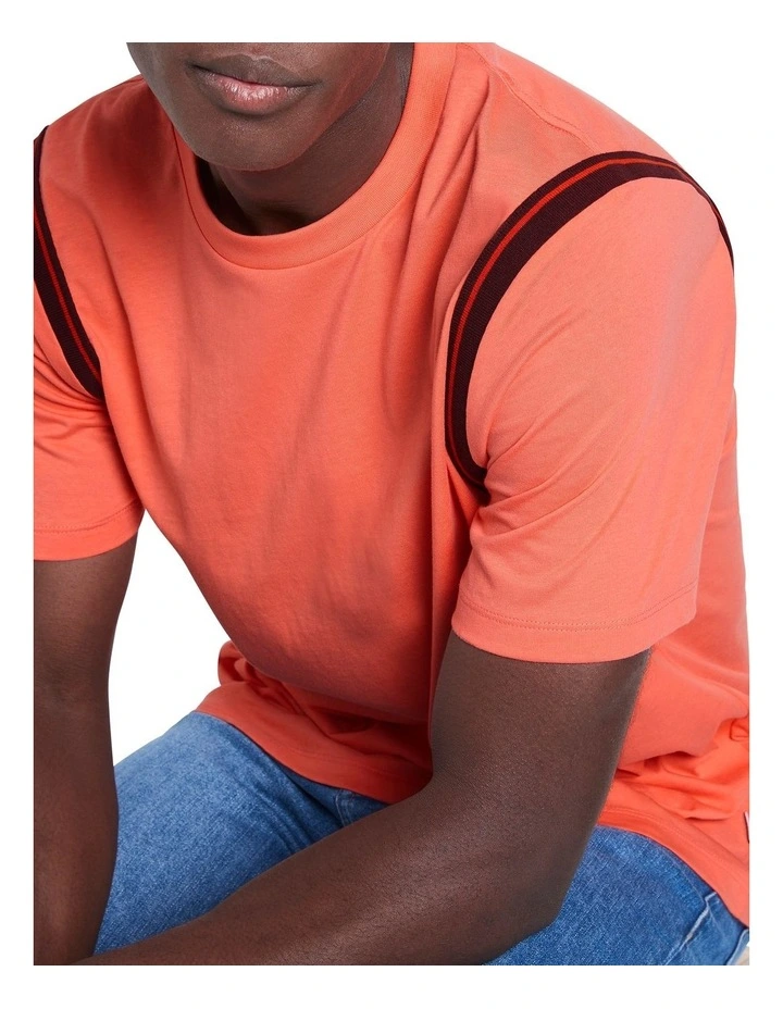 Upping the ante on classic tee styling, this tee plays vibrant coral against merlot and orange in contrast stripe detailing found at the soft rib feature at the shoulder. Beautifully soft, the tee remains lightweight and breathable in pure cotton, while working to create a relaxed fit finished with crew shaping at the neckline and short sleeves.