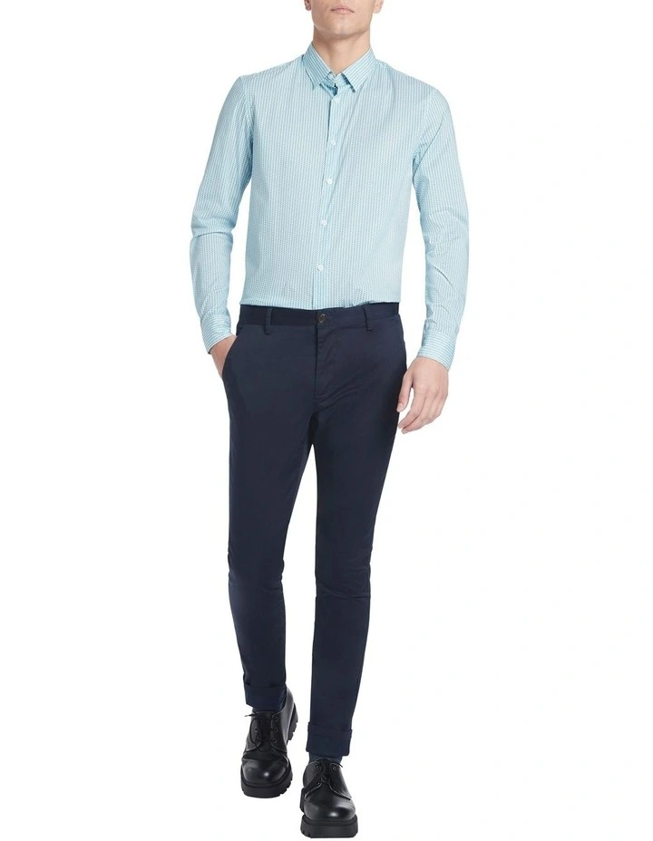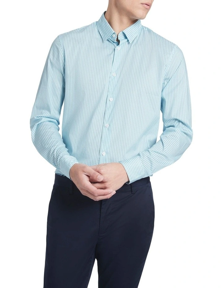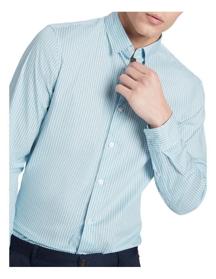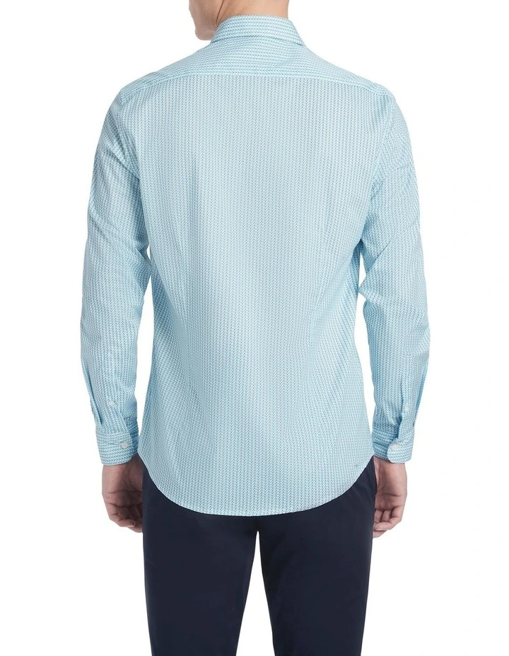 Playing up its graphic geometric print, this long sleeve shirt keeps its cool in pure cotton, to remain soft, breathable and lightweight no matter the season. Offering a slim fit with curved shaping at the hem, the shirt fastens at the front with white buttons, with further detail found in the classic shirt collar and neat button-up cuffs.