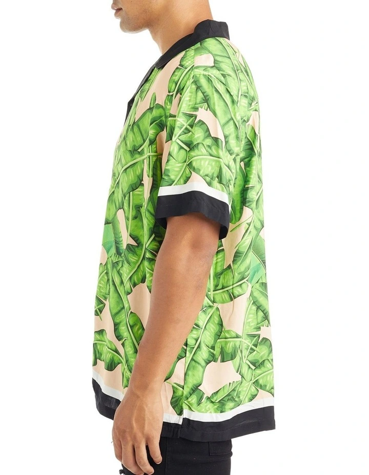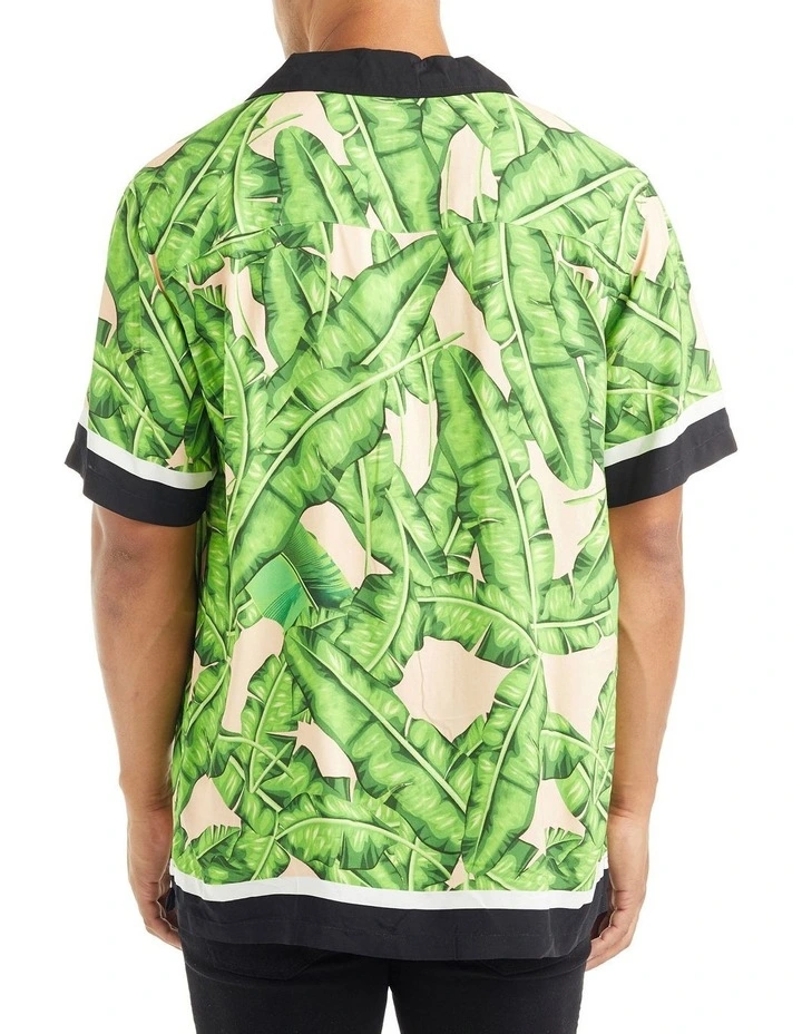 The Nana Judy Aeriel printed shirt is designed in a vibrant palm leaf print with black border trim detail. Cut from soft drape fabric this relaxed shirt fit features a button-down front with logo buttons and classic open styled collar finish.Â