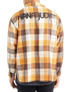 The Nana Judy Lennox Overshirt in Orange & Blue soft brushed plaid with curved hem detail and vintage buttons. This over shirt features premium raised logo embroidery across the back shoulder on a relaxed shirt fit which can be worn done up on its own or styled over a Maverick or Vintage Graphic Nana Judy Tee.Â