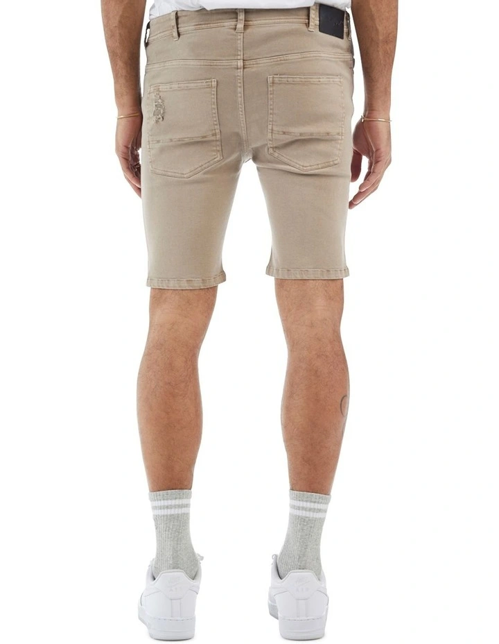 The NANA JUDY Thrift Short in Sanddune, Signature fit stretch-denim short featuring distressing detail, fixed waistband with button and zip closure for comfort and pocketing.