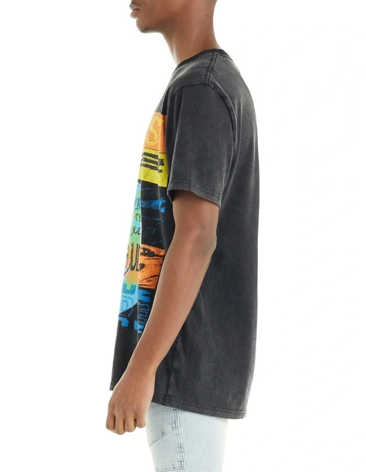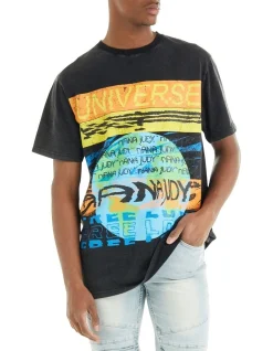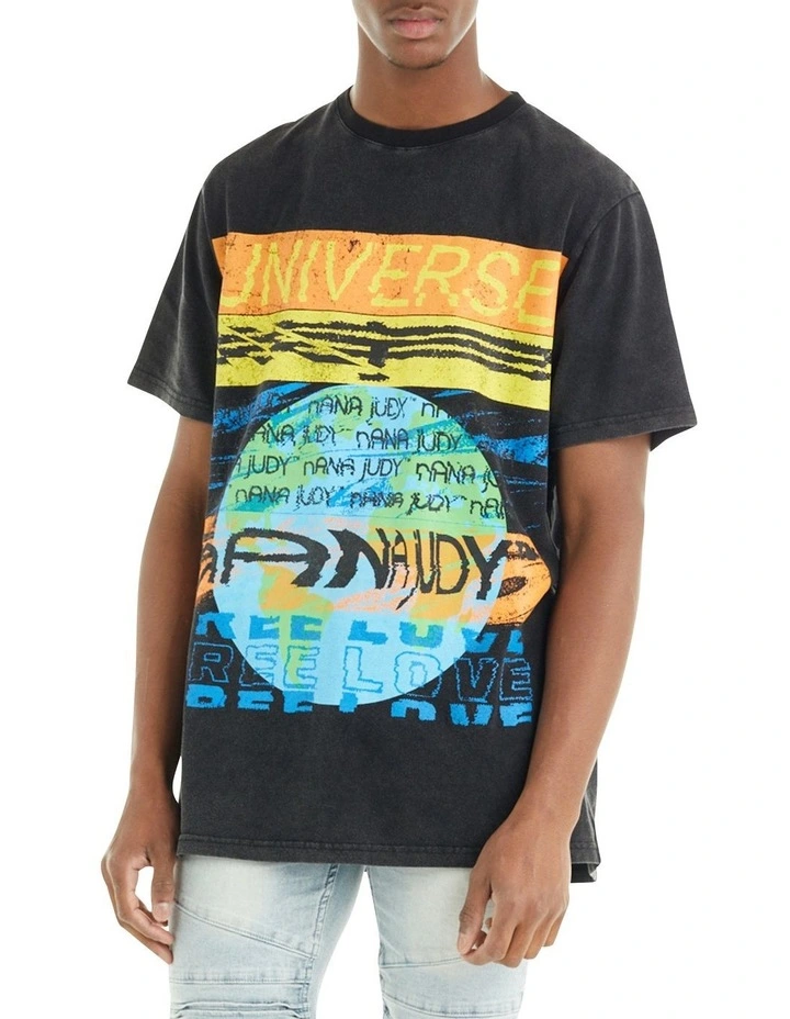 The Nana Judy Universe T-shirt is made in a premium soft washed cotton jersey in a vintage black wash. The T-shirt features a vibrant contrast universe graphic to the front body.