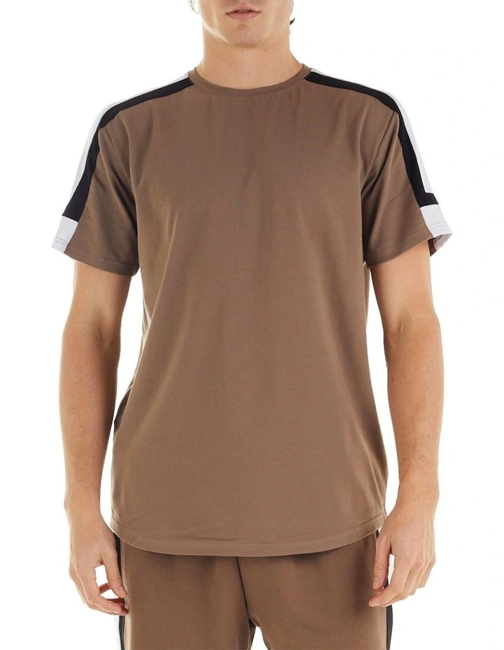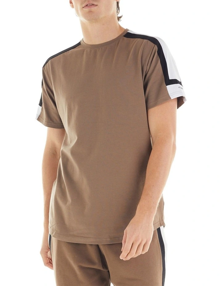 The T-shirt features contrast black and white sleeve panels finished with embroidered logo.