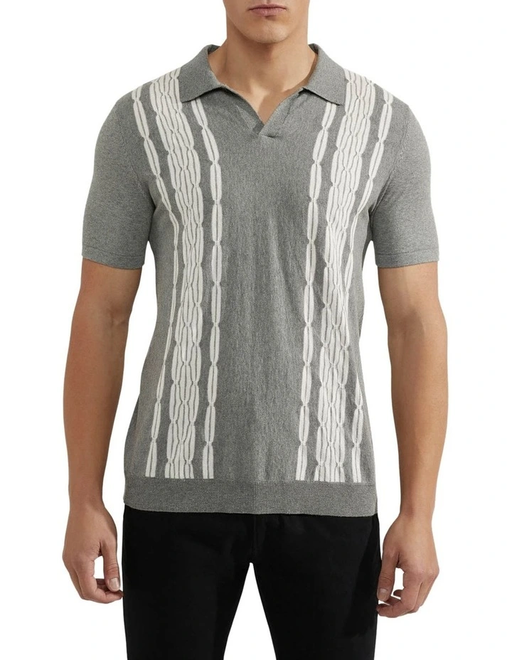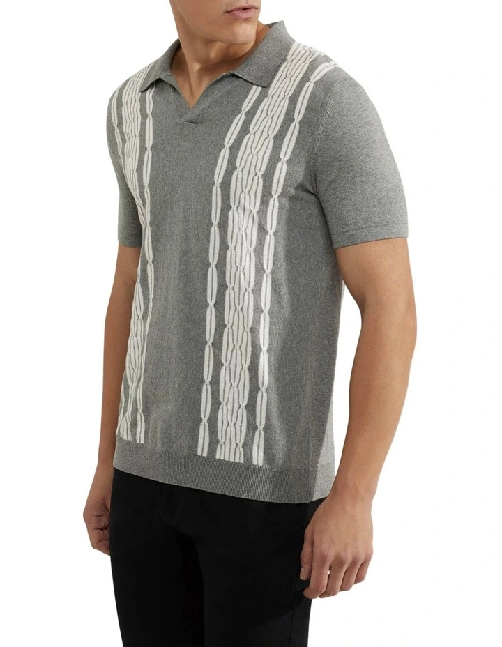 Give your look a preppy edge with the Finnigan Knitted Polo. This slim fit mens polo is crafted from cotton in a knitted weave. It features a small collar with an open v-neckline, a vertical linked stripe design, and ribbed trims. Team it with chinos and sandals for a relaxed yet dapper look.