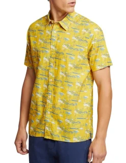 Set your style to leisure mode in the Leyton Linen Cotton Short Sleeve Printed Shirt. This regular fit summer shirt is crafted from a linen and cotton blend with a dapper tropical print. It features a small collar, short sleeves and a contrast back tab. Wear it with white chinos and sneakers to complete your party look.
