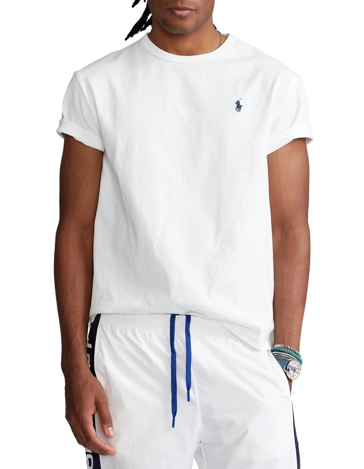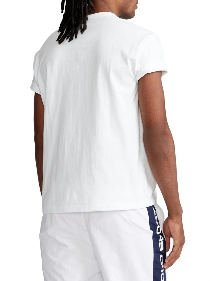 This T-shirt’s heavyweight jersey is inspired by a Polo fabric from the 1990s and updated with pure cotton. Classic Fit: our roomiest silhouette. Cut for a lower armhole and a fuller sleeve that falls closer to the elbow. Short sleeves.
