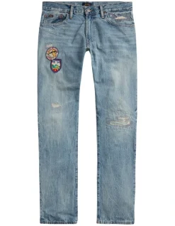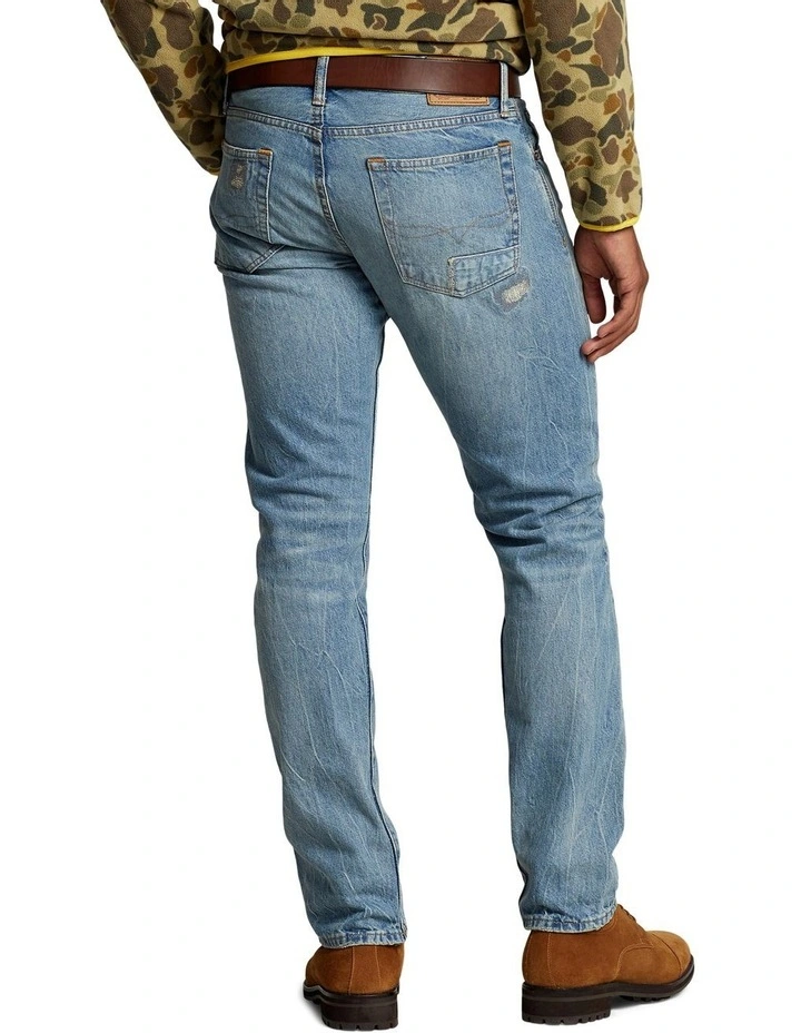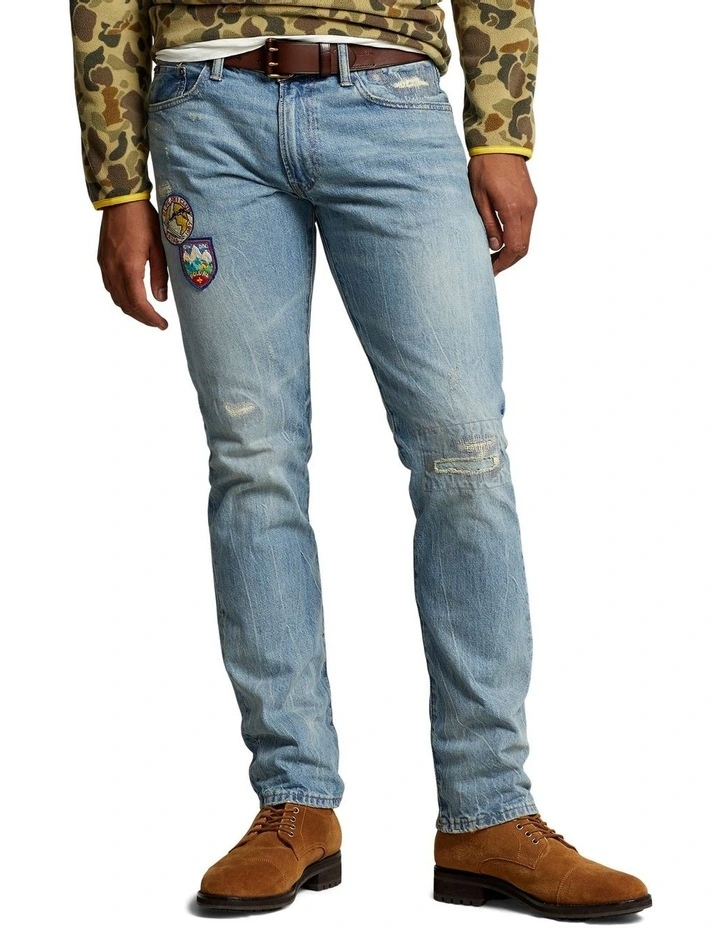 - “Polo RL” and “RLPC Ski Club” patches at the right thigh. Distressed throughout.