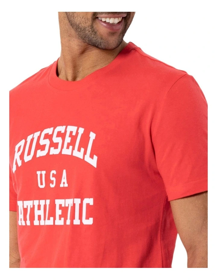 Elevate your everyday wardrobe with this russell athletic team arch tee in red. Featuring our unique arch logo chest print, with a signature heat seal logo on the sleeve. The soft, breathable jersey fabric, ribbed neckline and regular fit makes this tee an everyday must have!