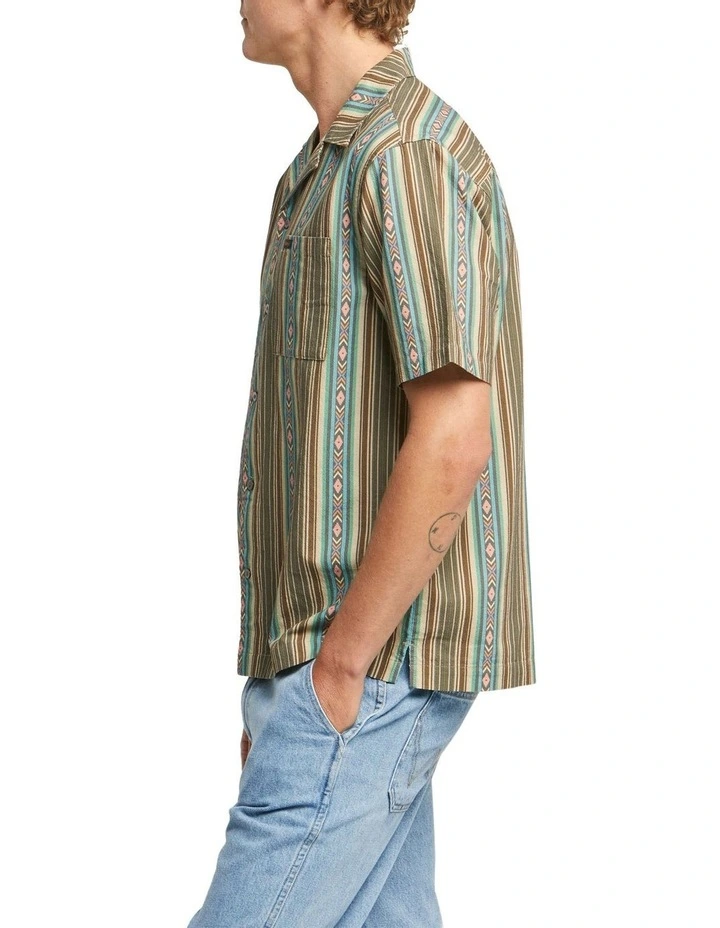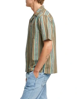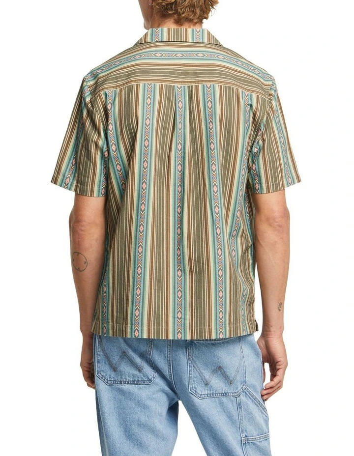The Wrangler Resort Shirt is a relaxed, boxy fit, short sleeve shirt with a resort style collar and a chest square patch pocket. Crafted in a soft textured cotton with an aztec inspired stripe pattern, wear it casually to the pub or to the beach.
