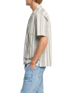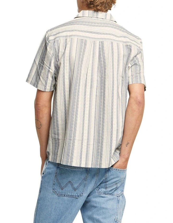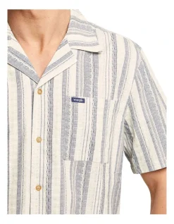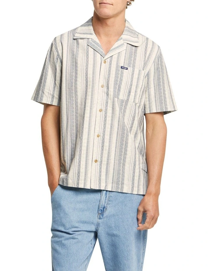 The Wrangler Resort Shirt is a relaxed, boxy fit, short sleeve shirt with a resort style collar and a chest square patch pocket. Crafted in a soft textured cotton with a greek inspired stripe pattern, wear it casually to the pub or to the beach.