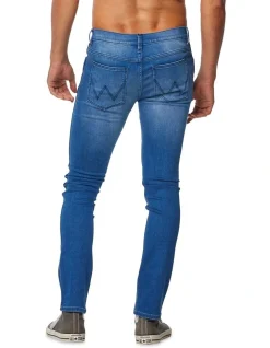 The Strangler is our super skinny fit. From hip to hem it’s exactly as it sounds: super tight and super tapered, yet super stretchy. The Strangler in Twist Blue is a bright blue, with natural whiskering for a vintage look.